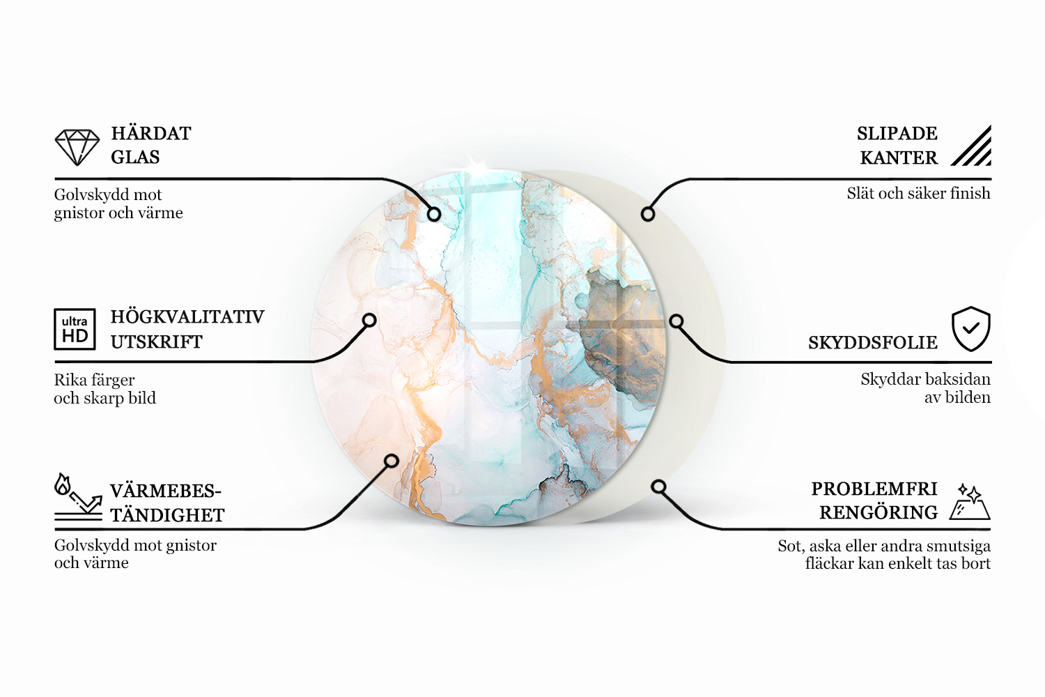 Förutom visuella fördelar erbjuder produkten rejält skydd. Din glasskiva framför öppen spis skyddar golvet från glöd och smuts, och du får sinnesro. Tack vare silikontassarna glider inte skivan, och trycket under glaset förblir intakt i åratal. Det är det perfekta underlägget som underlättar städning – det räcker att torka av med en mjuk trasa.